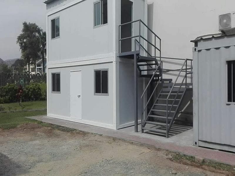En este caso presentamos un proyecto realizado en Villa El Salvador en el que el edificio modular ha sido instalado sobre una plataforma metálica elevada a más de 5 metros de altura para permitir el tránsito de montacargas bajo las propias oficinas.